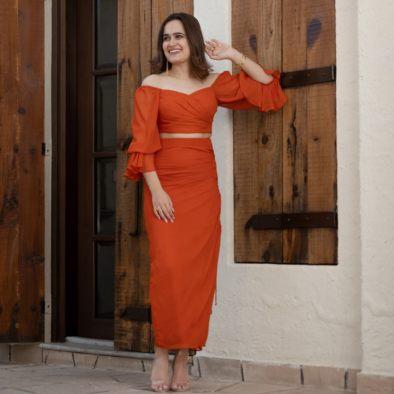 Get ready to slay in this Tangerine Georgette Co-ord Set. The sassy silhouette is perfect for any dance night. The straight fit skirt is as elegant as comfy. The uniquely designed top is gorgeous.